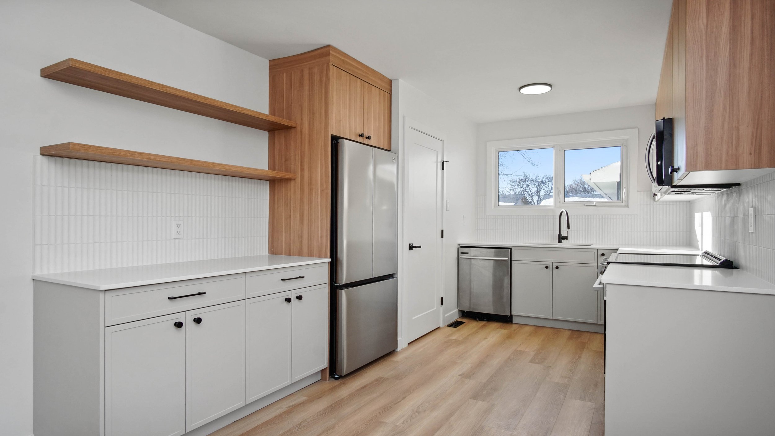 Full kitchen and mudroom renovation featuring a mix of thermofoil and premium melamine, creating a beautiful two-tone design with smart storage solutions.